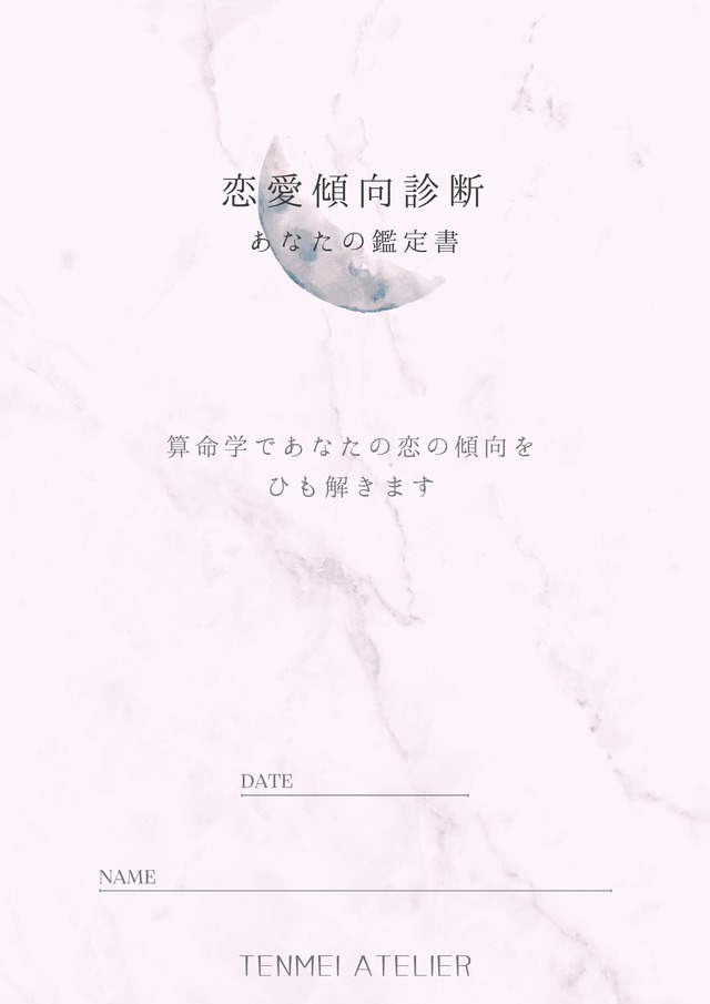恋愛に悩む20〜30代みなさまへ。 算命学で、あなたの「恋の傾向」と「惹かれる相手のタイプ」を読み解きます。 【商品概要】 恋愛って、なぜか毎回同じパターンでうまくいかない…。 相手のことも、自分のこともよく分からなくなってしまう。 そんな「恋愛迷子」になりがちな方へ向けた、算命学による恋愛診断です。 あなたの命式から、 ・恋愛で出やすい傾向やクセ ・無意識に惹かれやすい相手のタイプ ・相性が合いやすい人/ズレやすい人 ・心が満たされる恋愛スタイル を読み解き、PDF鑑定書としてお届けします。 恋に不安を感じたとき、自分を知ることが何よりのヒントになります。 この診断が、あなたにとっての“本命の恋”を見つける小さな地図になりますように。 【商品内容】 (PDF/全4〜6ページ) ・基本性質(あなたの命式から見る気質) ・恋愛傾向・恋のクセ・感情表現のパターン ・惹かれるタイプとその理由 ・恋愛でぶつかりやすいポイント ・相性がよい/避けた方がよいタイプの特徴 ・鑑定士からの一言アドバイス 【納期】 ご入金と必要情報の提出から3日以内にPDFデータにて納品いたします。 【購入後のご連絡方法】----------------------- ご購入時、「備考欄」に下記の情報をご記入ください: ★生年月日(西暦) ★性別(鑑定に関係します) ★お名前(ニックネーム可) ※わからない場合は、注文後にこちらからご案内いたします。 ----------------------------------------------- 【注意事項】 本鑑定は医療・法律・投資判断などには対応しておりません。 特定の個人への断定的な未来予測は控えています。 心理的サポートや自己理解を目的とした占いサービスとなります。